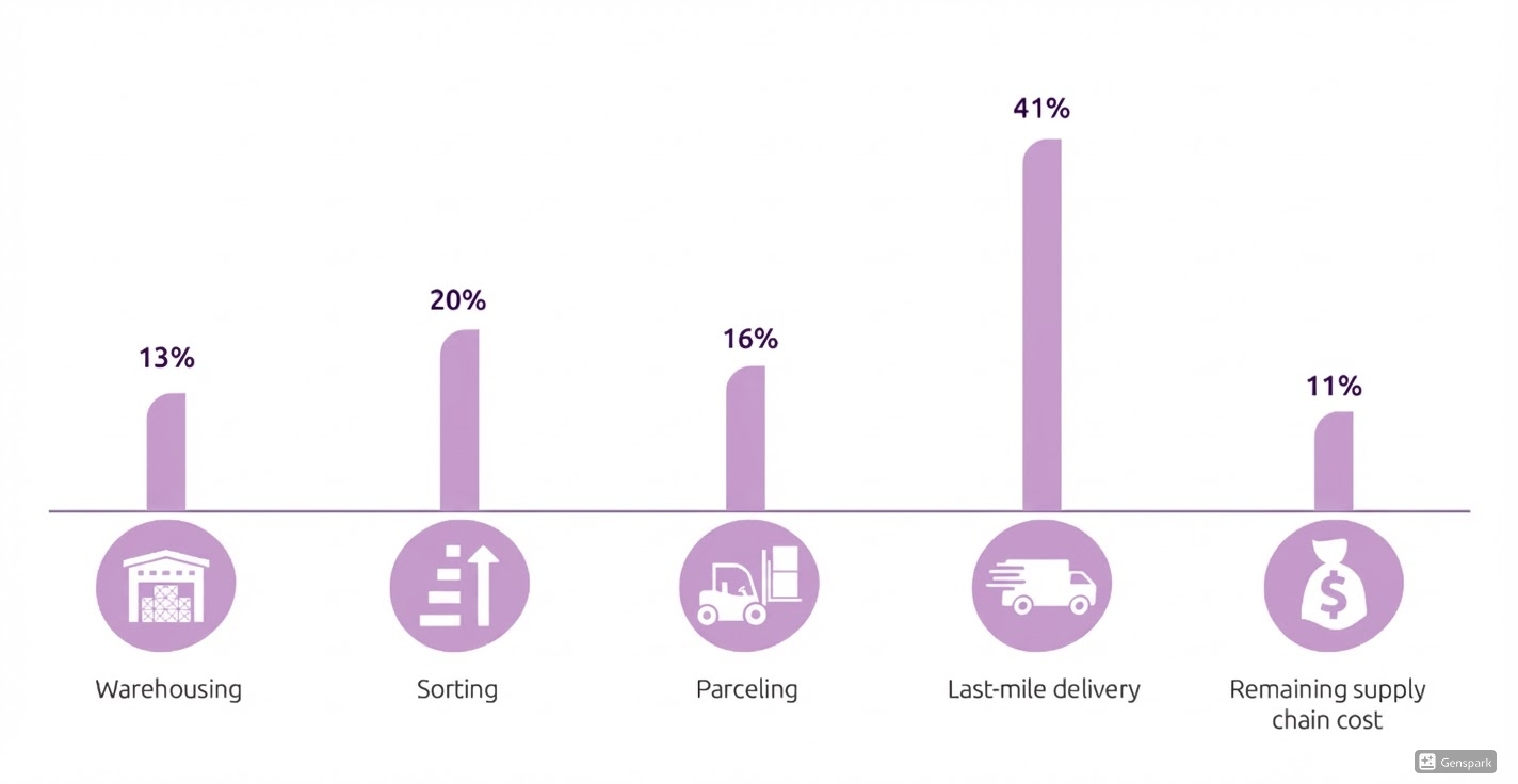 On the demand side, companies continue to pay for logistics on a massive scale. From a service perspective, customer expectations remain "two-day or faster" as the norm. Particularly in the last-mile, the burden of these costs is so significant that any sustainable unit-economics improvement scales to meaningful profit pools. For instance, Business Insider has referenced industry analysis showing that last-mile delivery accounts for 41% of overall logistics cost (a ballpark but handy heuristic for why route optimisation, depot density, and automation matter so much).